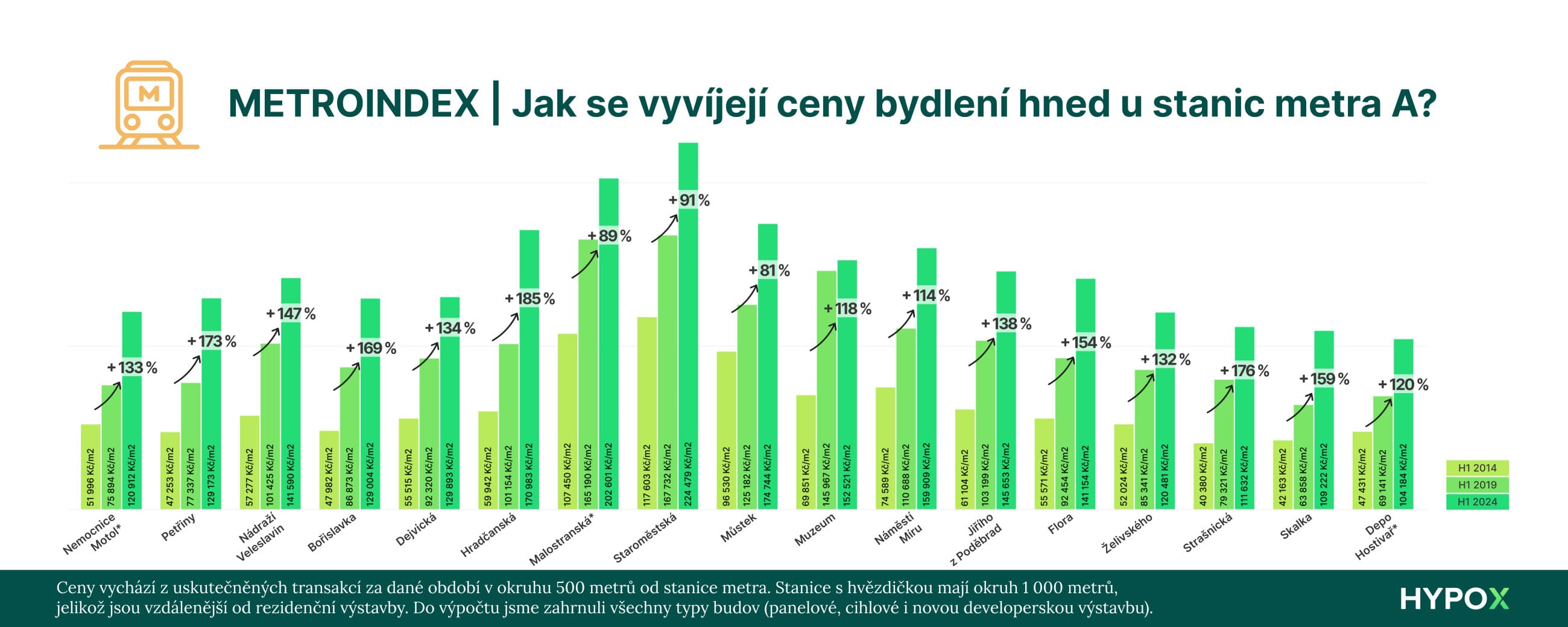 Na lince metra A je největším skokanem stanice Hradčanská, kde cena od roku 2014 vzrostla o 185 % z původních 59 942 Kč/m2 na aktuálních 170 983 Kč/m2.