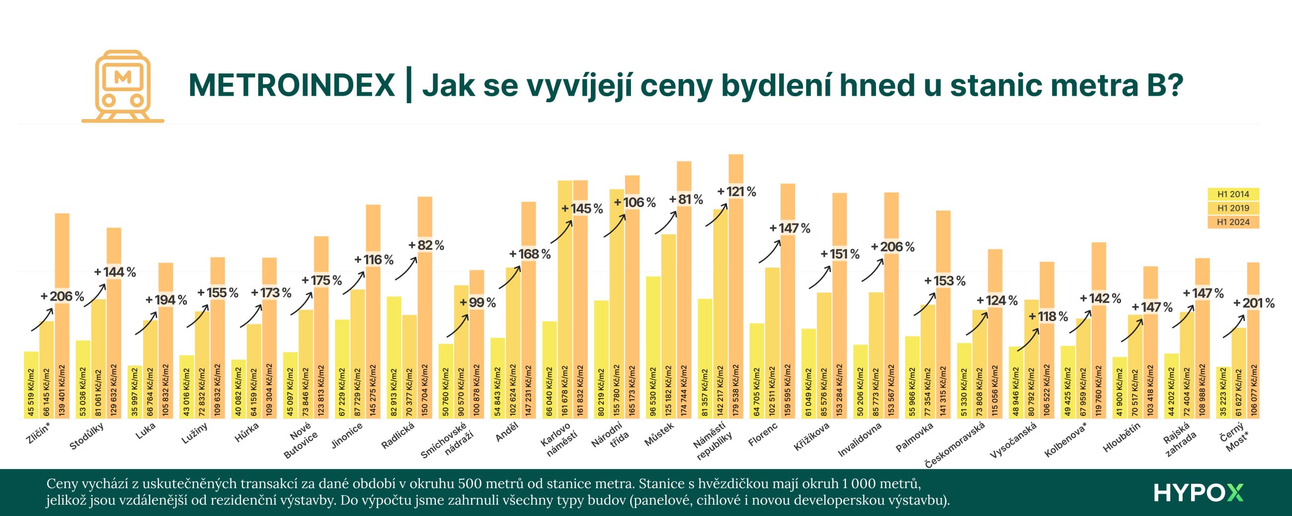 Lepší představu o nárůstu cen všech stanic nabízí pohled na jednotlivé linky pražského metra.