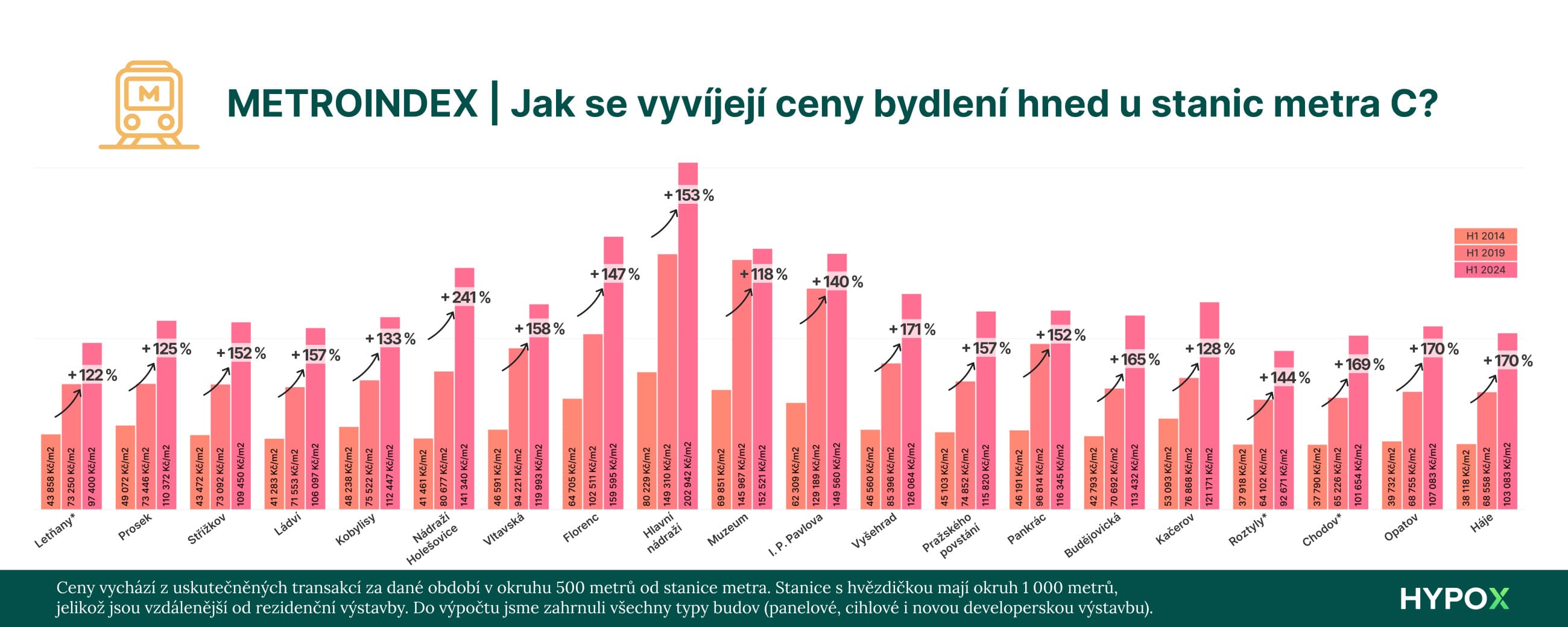 V případě linky C je největším skokanem výše zmiňovaná stanice Nádraží Holešovice, kde došlo k nárůstu o 241 %. Modelový byt o rozloze 70 m2 tam v roce 2014 vyšel na asi 2 900 000 Kč, stejný byt v této lokalitě bude mít dnes hodnotu téměř 10 000 000 Kč.