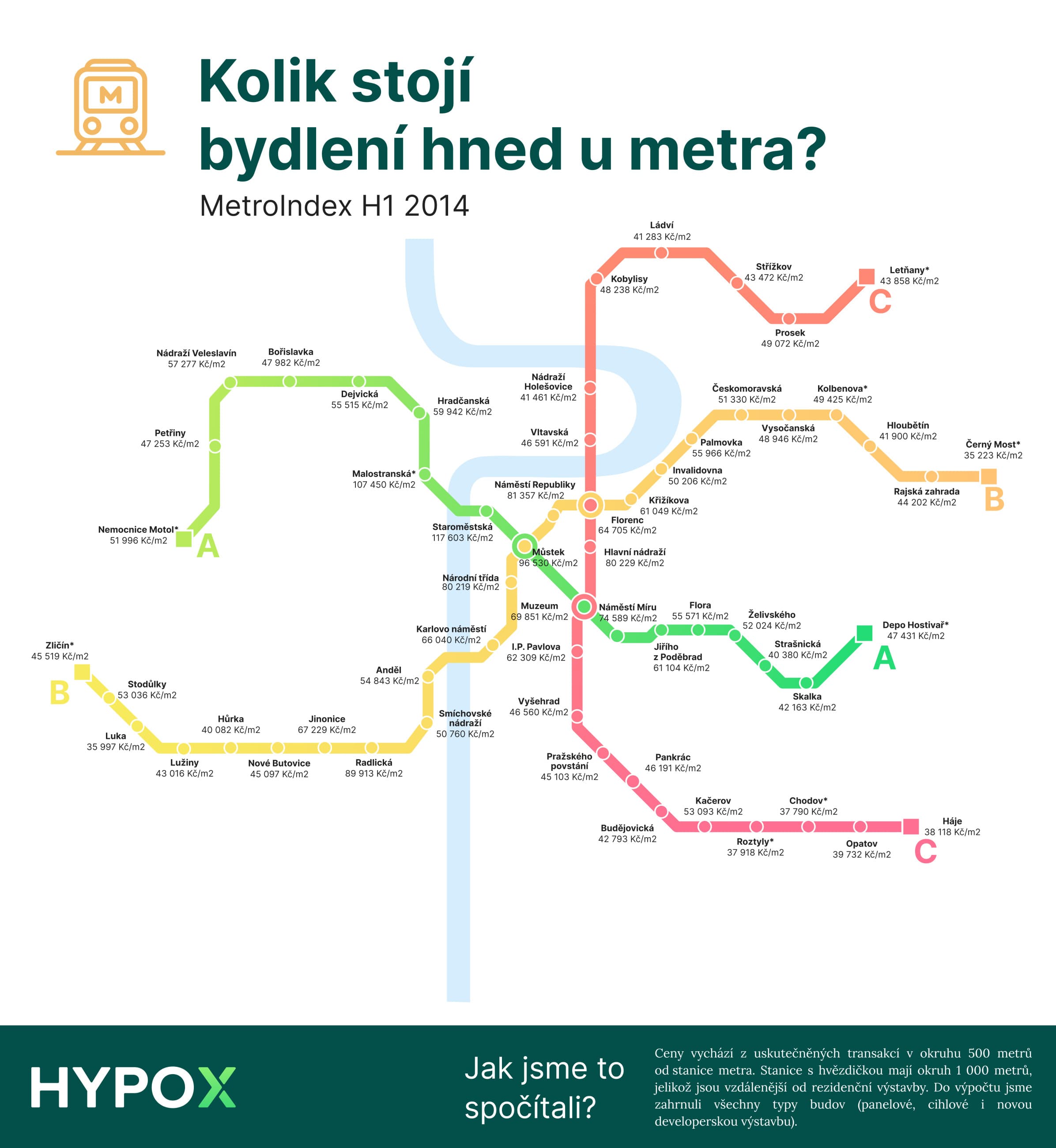 #Metroindex vydáváme už deset let dvakrát ročně, za první a druhé pololetí. Výsledné ceny vychází z provedených transakcí zapsaných v katastru nemovitostí v daném období. Započítáváme pouze byty, které se nachází ve vzdálenosti do 500 metrů od metra. U stanic s hvězdičkou jde o vzdálenost 1 km, jelikož jsou vzdálenější od rezidenční výstavby.