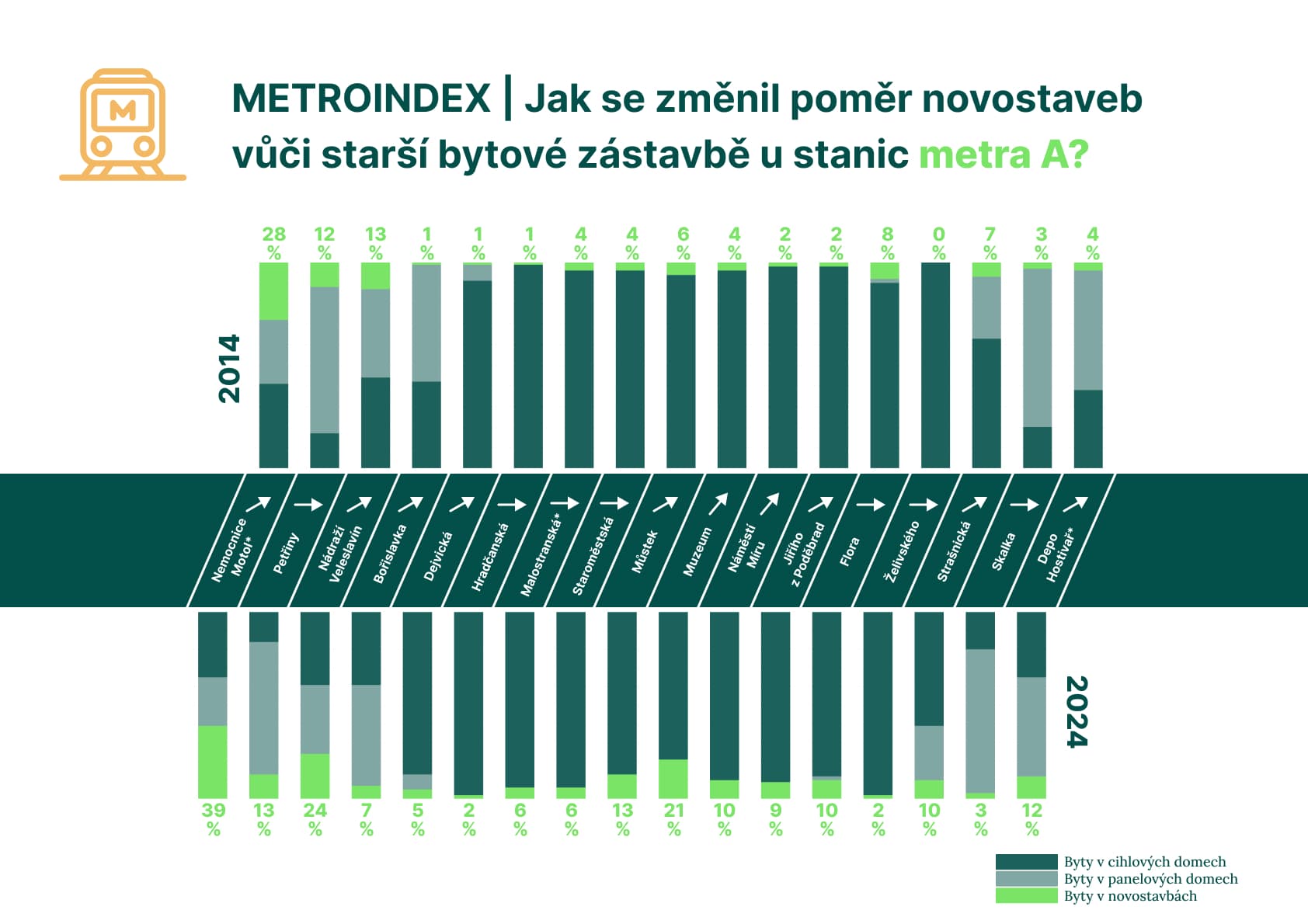 Transformace bytového fondu u stanic metra: Proč některé lokality zdražily víc než jiné? #Metroindex