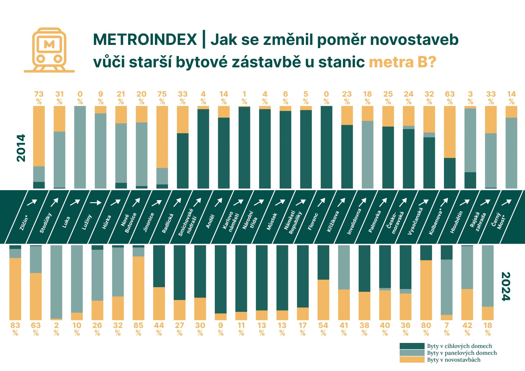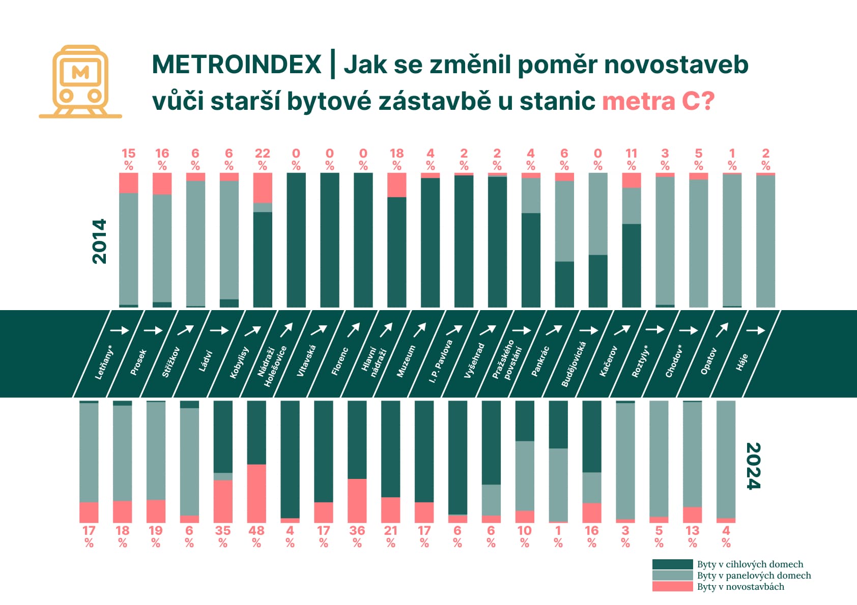 Stabilní a v posledních deseti letech málo proměnnou skladbu bytového fondu má okolí celé řady stanic metra. Na trase A jsou to např. stanice Hradčanská, Malostranská a Staroměstská, na trase C stanice Budějovická, Roztyly nebo Chodov. Právě změna skladby bytového fondu, kdy se vedle staré zástavby staví nové bytové domy a rozvíjí se celá území ovlivňují lokální ceny úplně nejvíc. Může se tak stát, že i velmi blízké stanice metra mají velké rozdíly v cenách. Tento případ je evidentní například v případě stanic Jinonice a Radlická na trase B, které díky většímu podílu novostaveb vycházejí výrazně dráž než v okolí Smíchovské nádraží. U Smíchovského nádraží lze však očekávat, že ceny výrazně vzrostou po dokončení aktuálně rostoucí developerské výstavby, především Smíchov City. Dalším markantním příkladem je např. stanice Nádraží Holešovice, kde před 10 lety byla v nejbližším okolí pouze zástavba staršími cihlovými domy a za deset let vzrostl podíl nových bytů z 0 % na 48 %. I to vysvětluje pozici “největšího skokana” při porovnání cen 2014 a 2024.